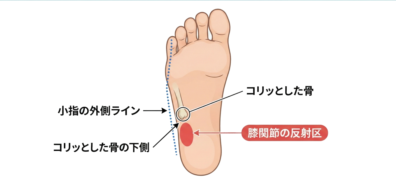 コリッとした骨をさわれると思います。その下(かかとより)が膝関節の反射区です。