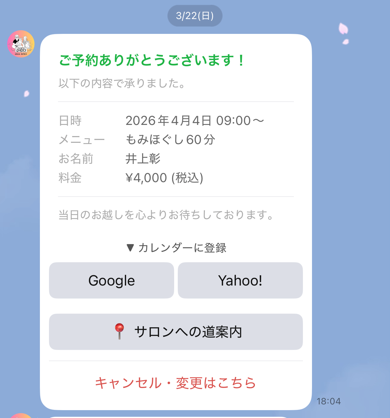 2.予約が完了しましたら、こういう画面が届きます。