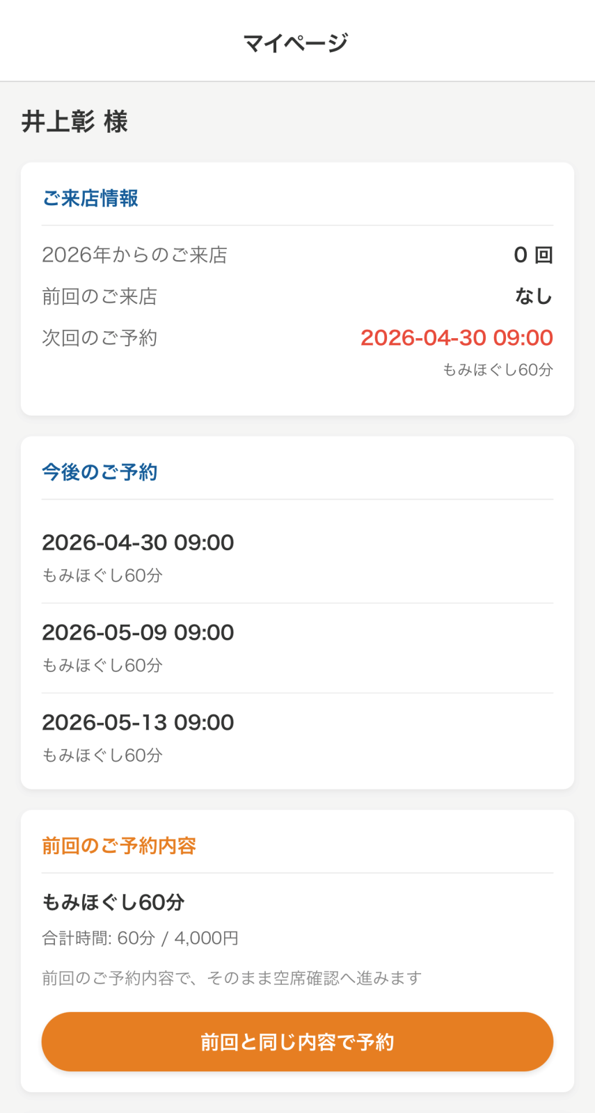 このマイページからは、次回予約とかの情報を見ることができます。